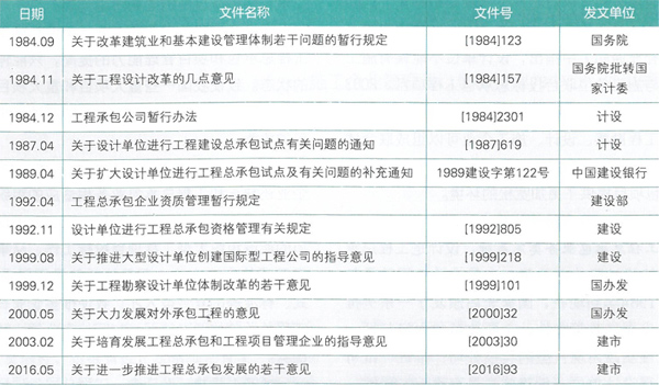 20世紀80年代,我國相關部門就下發(fā)文件,要求在設計、施工企業(yè)組建開展工程總承包的試點,從國家頒布的一系列文件中可以看出我國在推廣工程總承包業(yè)務方面的幾點變化(見表2 )。