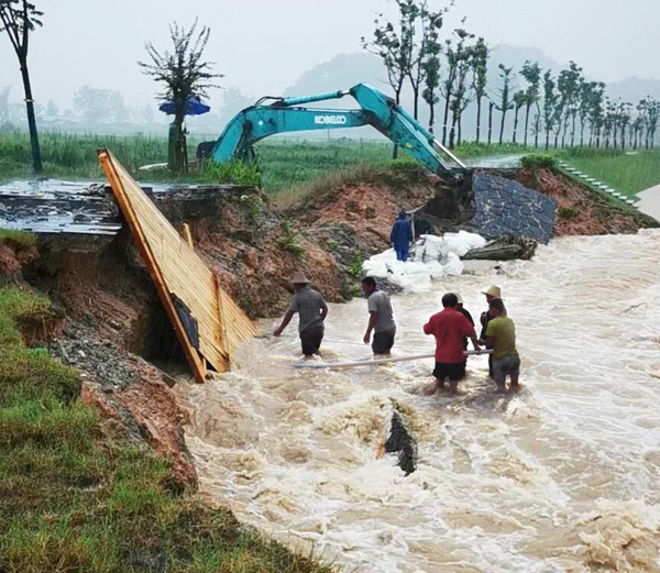 進(jìn)入7月以來,昌江河流域普降暴雨,橋溪水河水位大漲。7月7日,公司接到業(yè)主汛情通報,已完工驗(yàn)收工程多處出現(xiàn)險情;汛情就是命令,時間就是生命,公司迅速組建了一支裝備精良、經(jīng)驗(yàn)豐富的專業(yè)搶險突擊隊,由副總經(jīng)理曾朝文、總經(jīng)理助理杜凌帶隊,連夜奔赴浮梁抗洪一線,組織設(shè)備、人員、材料進(jìn)場,進(jìn)行搶險救災(zāi)工作。